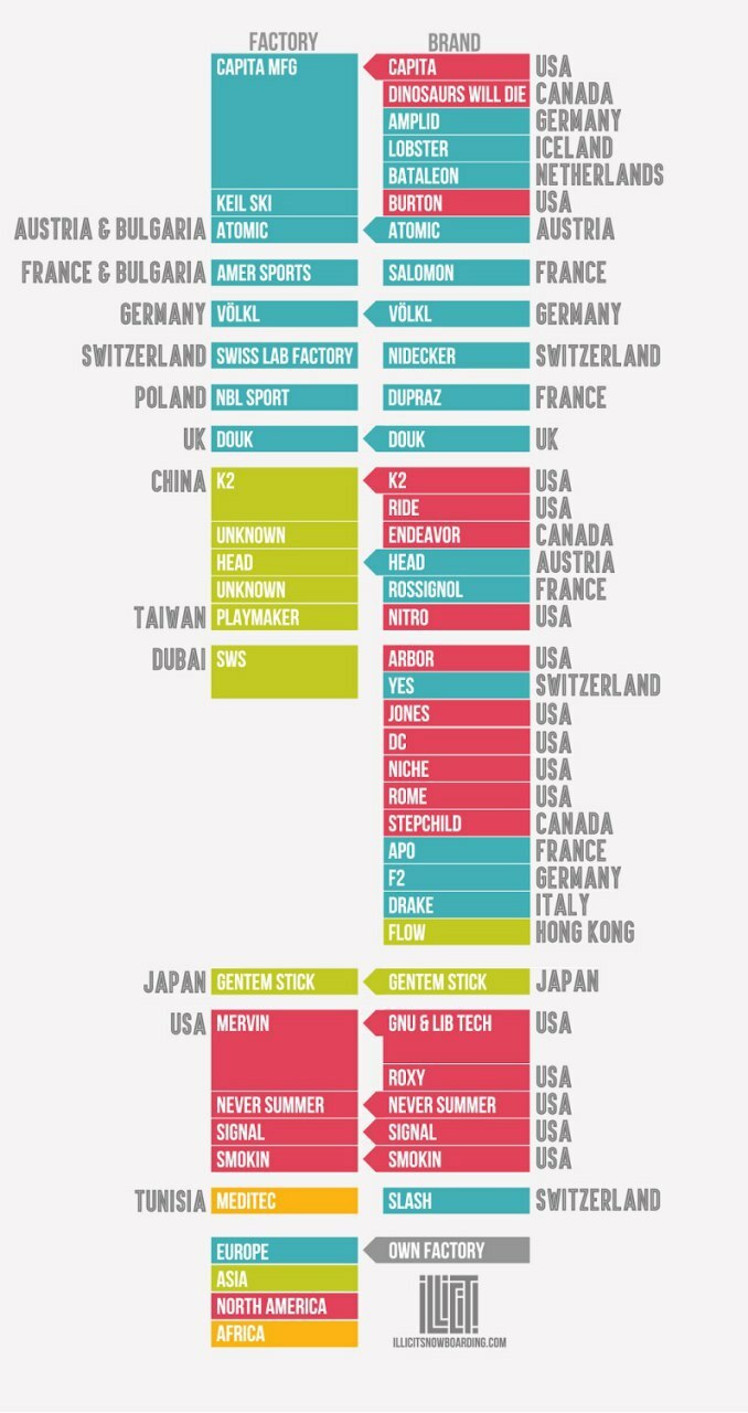 Хорошим примером как это можно делать является Jones Snowboards. Как и многие другие компании они выбрали ОЕМ производителя в Австрии, GST Factory. После закрытия GST Factory в 2015, Jones делают свои доски на фабрике SWS в Дубаи.